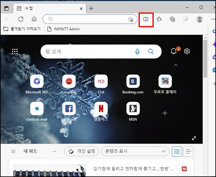 엣지가 재실행하면 상단에 분할 아이콘이 생깁니다. 클릭해주세요