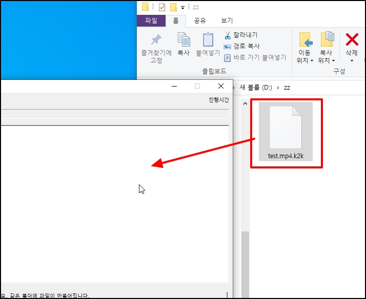 오면 복호화하기 위해 k2k 파일을 k2k333 프로그램 위에 드롭 합니다.